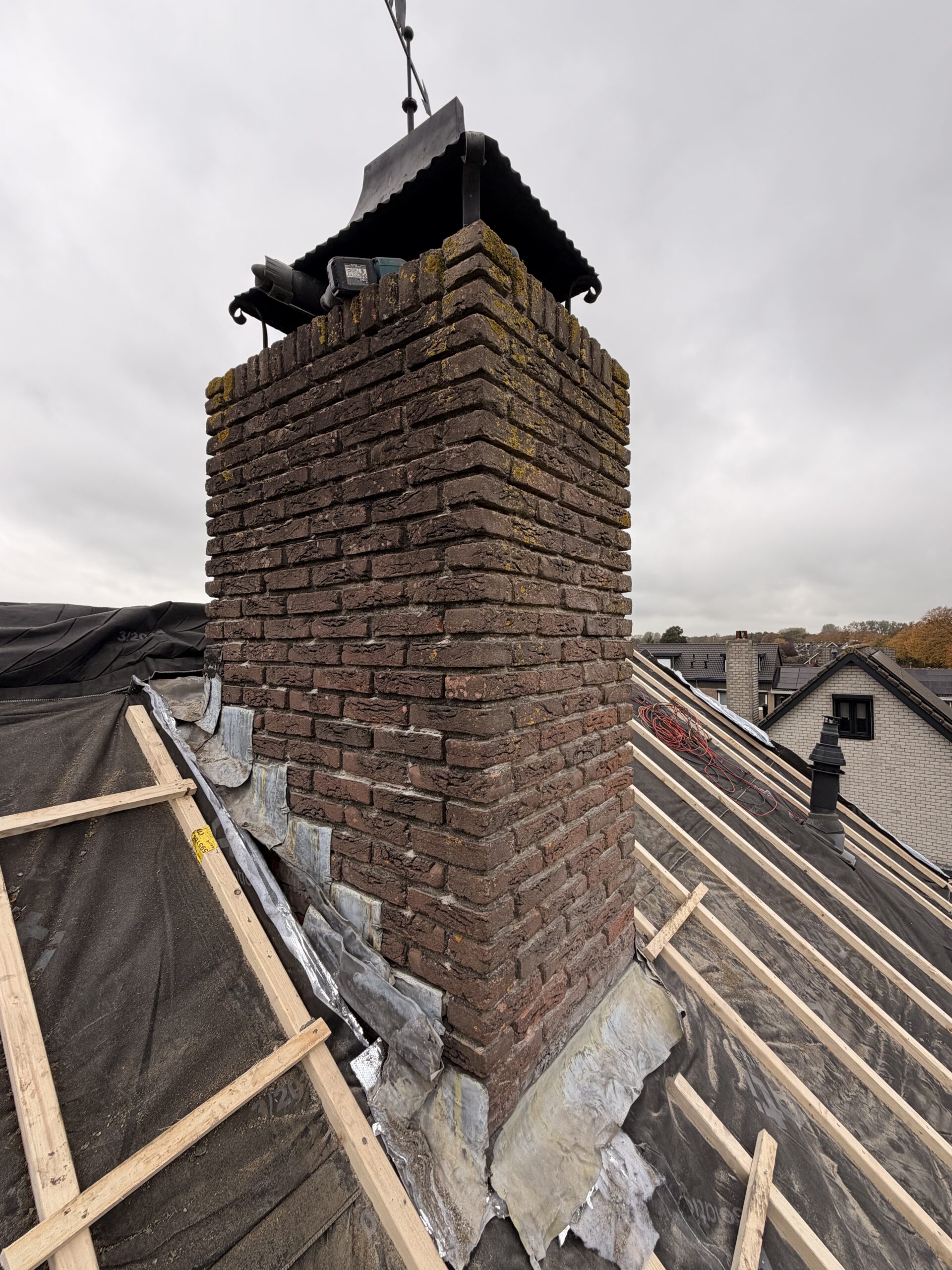 In Roosendaal hebben wij een complete schoorsteenrenovatie uitgevoerd. Het bestaande loodwerk rondom de schoorsteen is zorgvuldig verwijderd en vervangen door nieuw, duurzaam lood dat weer zorgt voor een waterdichte aansluiting op het dak. Daarnaast is het verouderde voegwerk volledig uitgeslepen en opnieuw gevoegd, waardoor de schoorsteen zowel technisch als visueel in optimale staat is hersteld.